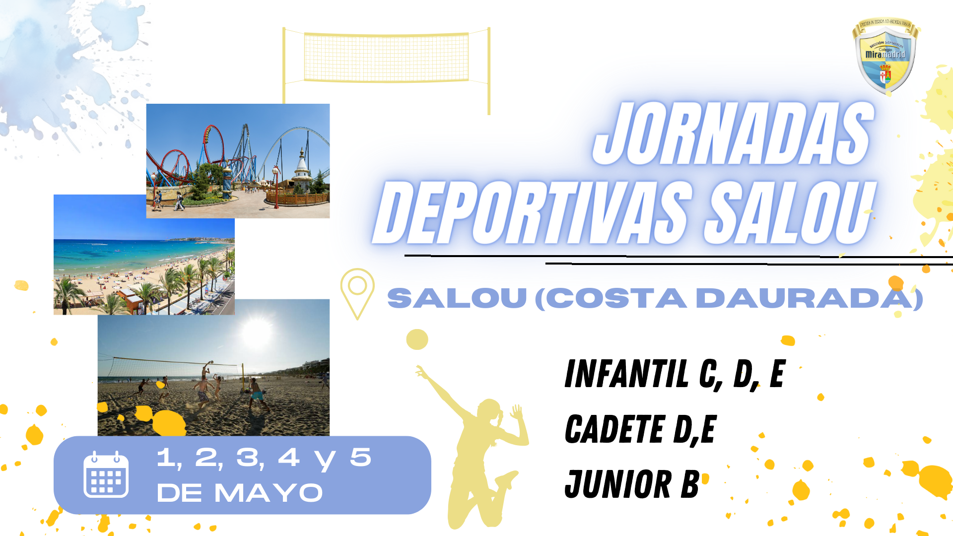 Nuestros equipos de voleibol: Infantil C, D , E, Cadete D , E y Junior B de Voleibol, realizarán unas jornadas deportivas en Salou (Costa Daurada) los días, 1, 2, 3, 4 y 5 de mayo. Allí los equipos disfrutarán de entrenamientos y amistosos contra equipos de la zona, además de un día completo en portaventura.