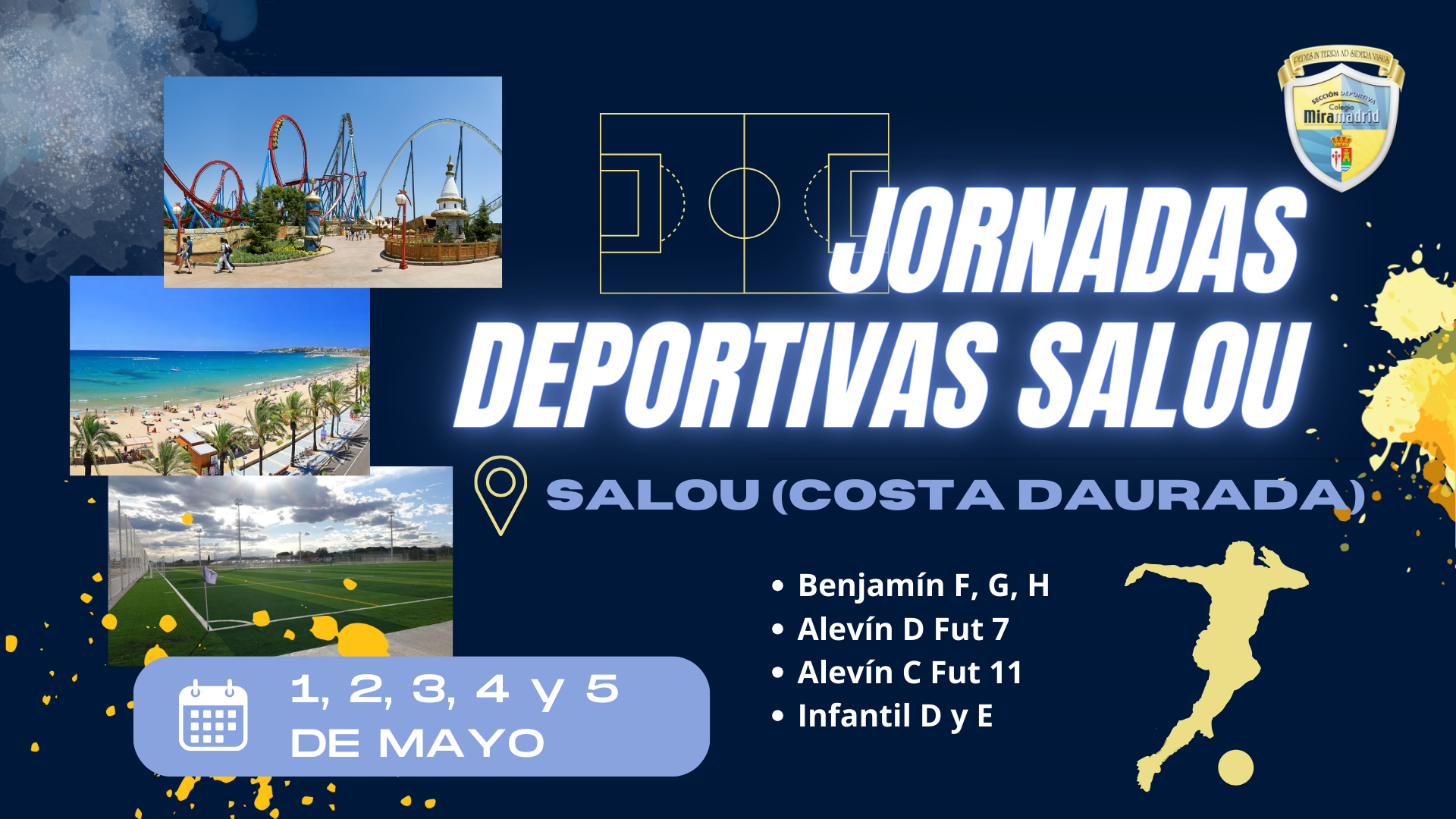 Nuestros equipos de fútbol: Benjamín F, G, H, Alevín F7D, Alevín F11C, Infantil D y E, realizarán unas jornadas deportivas en Salou (Costa Daurada) los días, 1, 2, 3, 4 y 5 de mayo. Allí los equipos disfrutarán de entrenamientos y amistosos contra equipos de la zona, además de un día completo en portaventura.